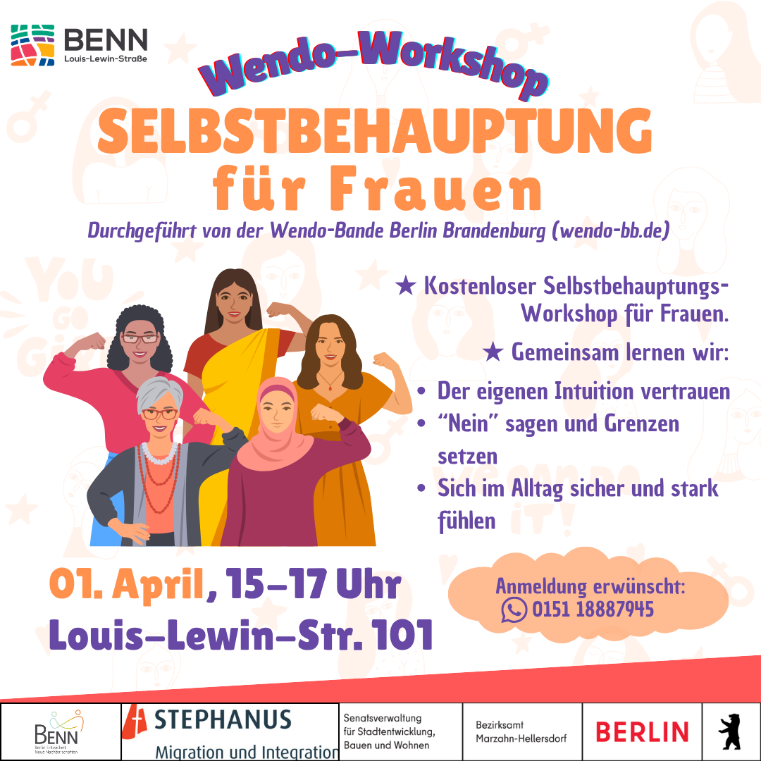 Ein Kostenloser Selbstbehauptungsworkshop für Frauen. Gemeinsam lernen wir: Der eigenen Intuition vertrauen "Nein" sagen und Grenzen setzen Sich im Alltag sicher und stark fühlen Anmeldung erwünscht: (WhatsApp) 0151 1888 7945 |