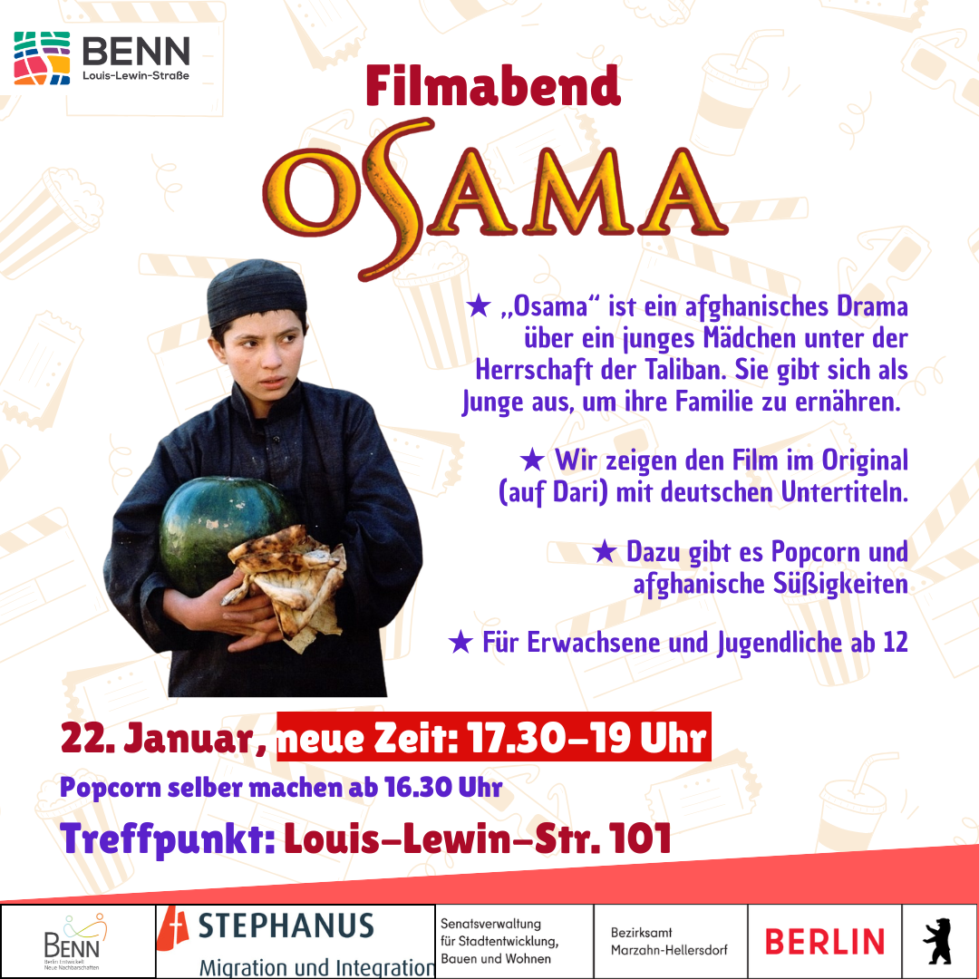 Kommt vorbei für einen gemütlichen Film-Abend mit Popcorn und Snacks! Dieses Mal schauen wir uns „Osama” an, ein afghanisches Drama über ein junges Mädchen unter der Herrschaft der Taliban. Sie […]