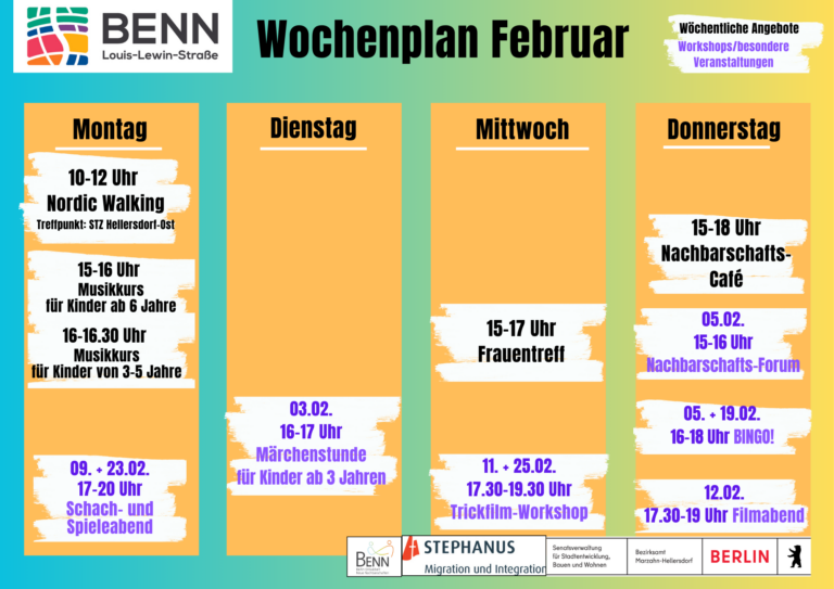 Im Februar erwarten euch bei BENN-LLS wieder vielfältige Veranstaltungen: eine Vorlesestunde für Kinder ab drei Jahren, ein Trickfilm-Workshop über die Lebensgeschichten von Hellerdorfern, ein Filmabend und ein Nachbarschaftsforum. Beim Nachbarschaftsforum freuen wir uns auf euer Feedback und eure Ideen, um…