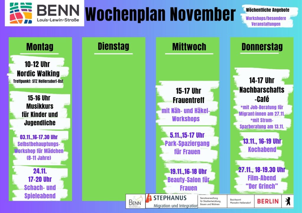 Um die Dunkelheit zu vertreiben, findet ihr bei uns einige wärmende Angebote im November: Neben unseren üblichen Veranstaltungen warten auf euch ein vorweihnachtlicher Filmabend (27.11.), der letzte Kochabend dieses Jahr (13.11.), sowie ein Beauty-Salon für schöne Haare und Nägel (19.11.)! Wir freuen uns auf euch!